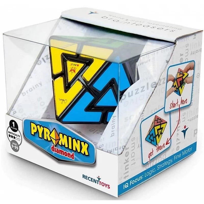 Así que ya dominas Pyraminx Duo... pero ¿ya lo has intentado con Pyraminx Diamond? Al igual que con Pyraminx Duo, simplemente gira cada punta, de manera que el centro adyacente también gire. Sin embargo, nada es realmente fácil cuando hay que hacer coincidir ocho lados en lugar de cuatro: ¡es el doble de complicado!