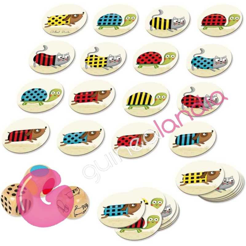 Coloca las piezas sobre la mesa y lanza los 3 dados por turnos y encuentra la combinación: animal vestido color. ¡Sé el más rápido en encontrar la pieza!