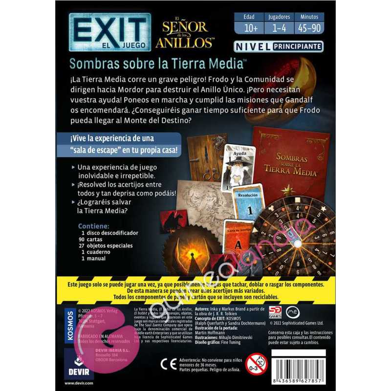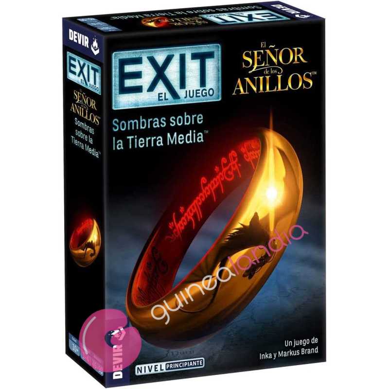 Exit: El Señor de los Anillos, sombras sobre la Tierra Media es un juego de escape cooperativo diseñado por Inka y Markus Brand, inspirado en el universo de fantasía épica creado por J.R.R. Tolkien. Se puede disfrutar en solitario o en un grupo de hasta 4 personas, a partir 10 años, en partidas que pueden durar entre 60 y 90 minutos. A través de 90 cartas, un cuaderno y algunos objetos especiales, los jugadores podrán explorar e interactuar con el entorno y todo lo que vayan encontrando en su camino para tener éxito en la aventura.