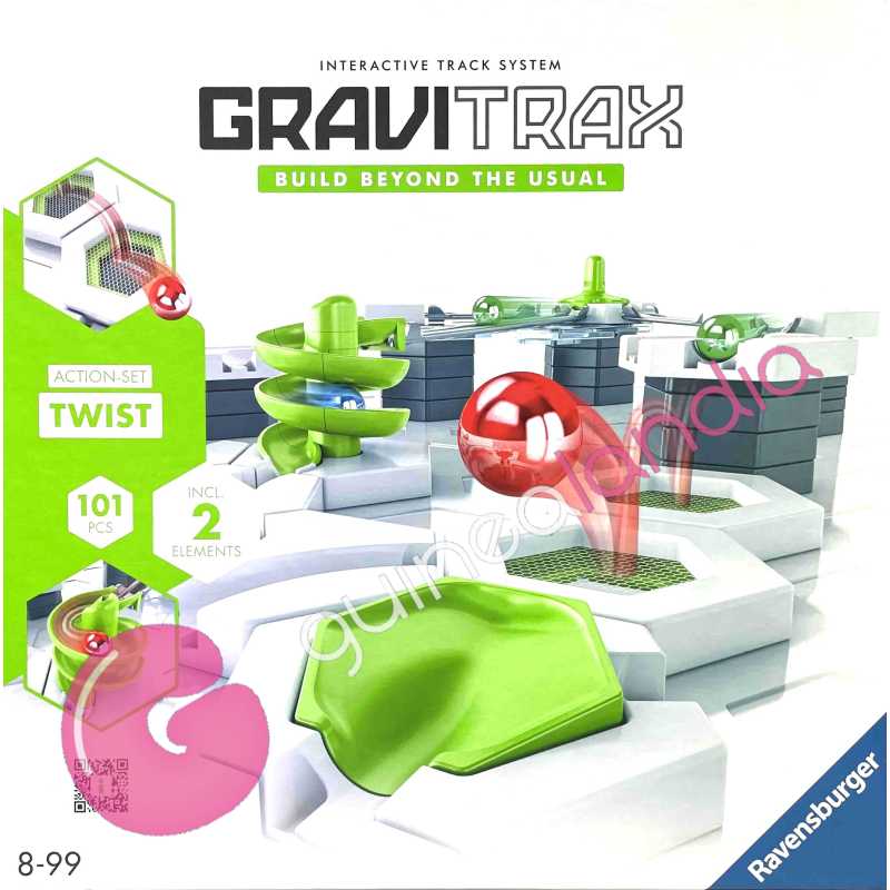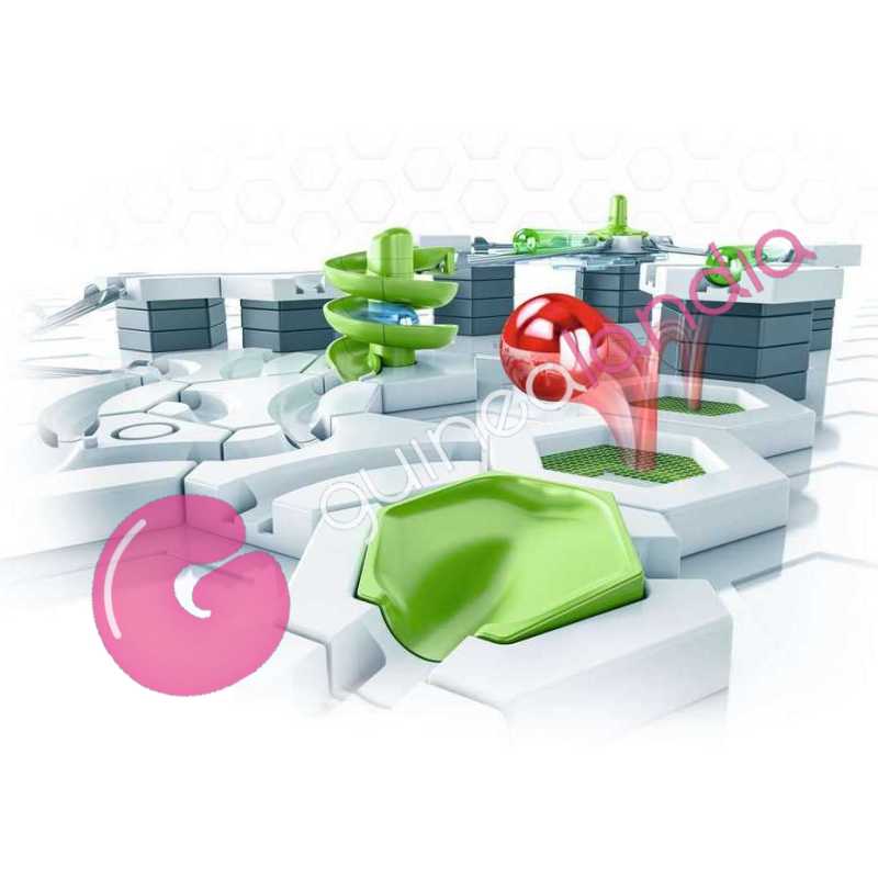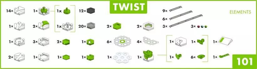 - 101 piezas: 1 elemento espiral, 1 elemento trampolín, 1 3-EN-1, 1 torbellino, 14 curvas, 2 intersecciones, 2 bisillas, 1 balls & spinner, 12 bloques de construcción finos, 20 bloques de construcción gruesos, 3 bolas, 9 rieles cortos rectos, 6 rieles medios rectos, 3 rieles grandes rectos, 1 llegada, 4 medias bases de cartón, 6 bases de cartón completas, 1 plataforma, 1 teja splash, 1 teja llegada, 2 tejas de captura, 1 teja caída libre