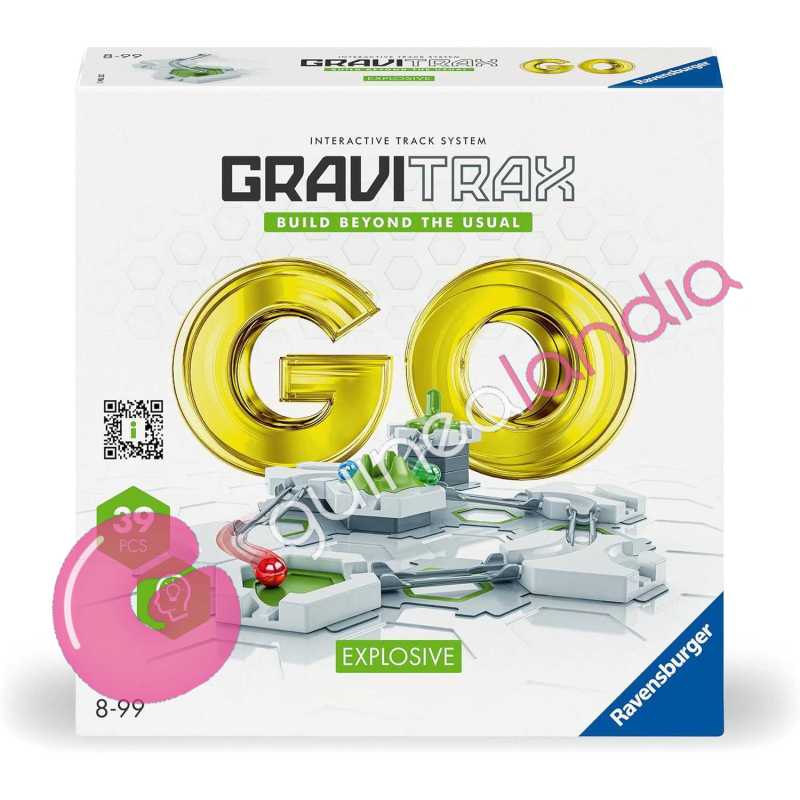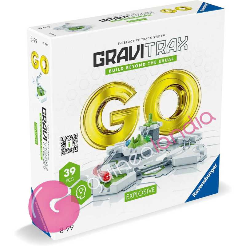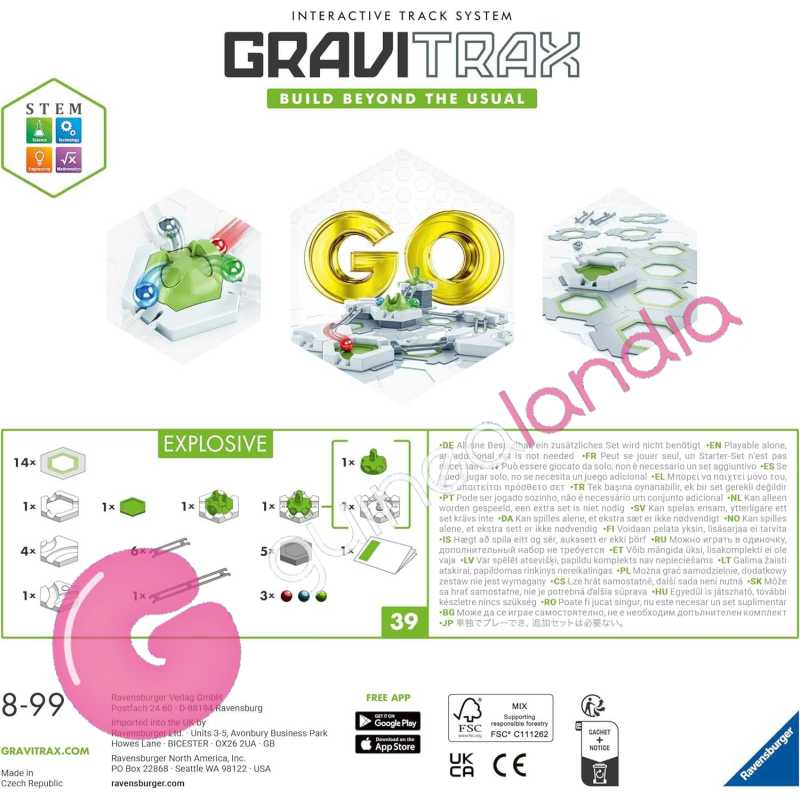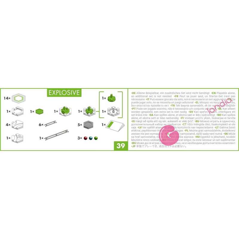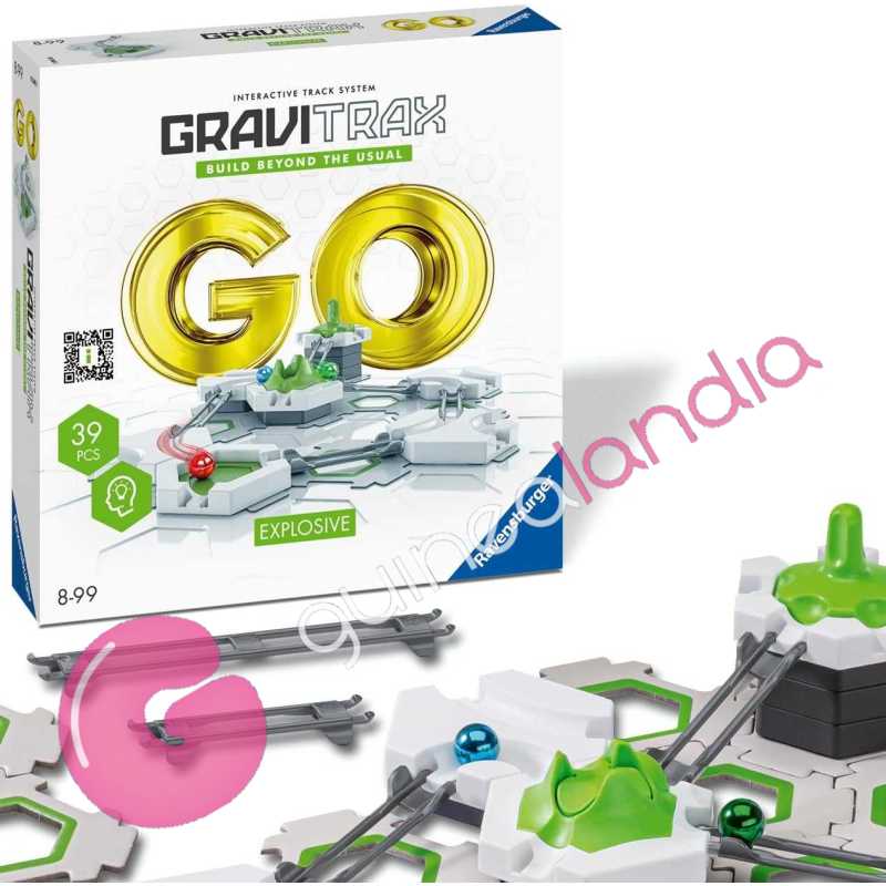 GraviTrax GO Explosive incluye todo lo necesario para conocer GraviTrax. Curvas, pistas y bloques de altura, junto con las pequeñas placas hexagonales, crean la base para pistas individuales con el Elemento de Acción Volcán. ¿Hasta dónde llegarán las bolas después de la "explosión volcánica"?