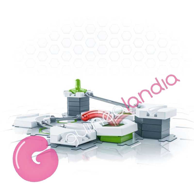 Contiene todo lo que necesita para familiarizarse con GraviTrax! Las curvas, los rieles, los bloques de construcción y piezas básicas, necesarias para crear tus circuitos con el elemento estrella: el Trampolín. ¿Hasta dónde y a qué altura salta la bola del trampolín?