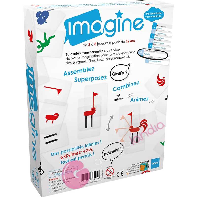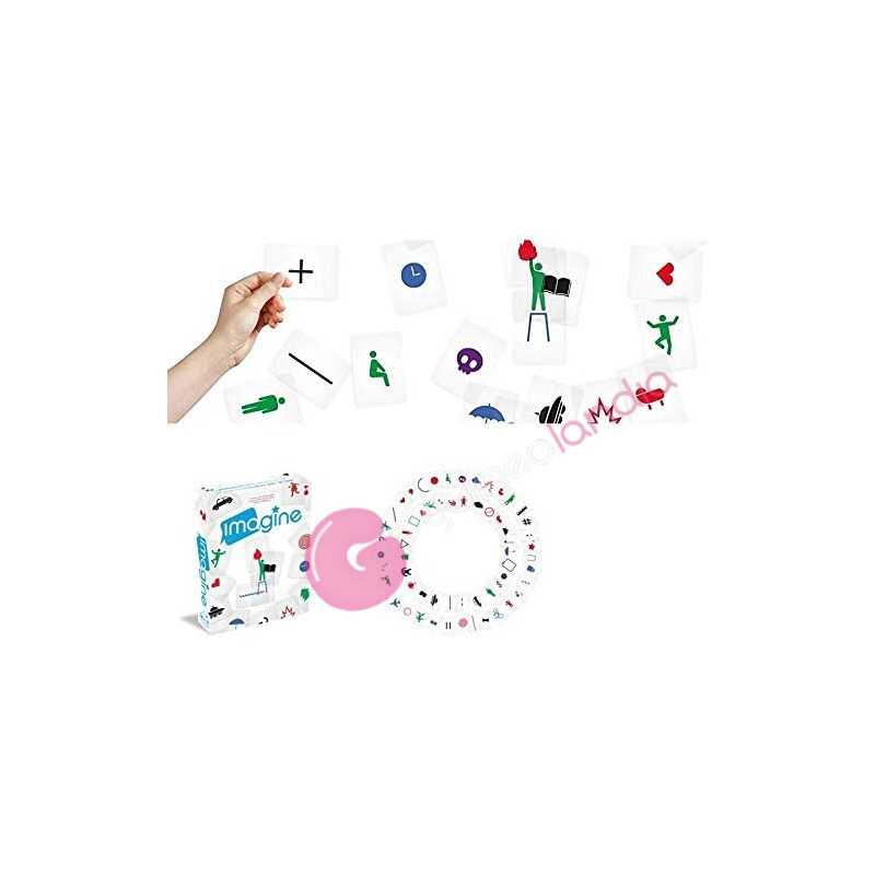 Imagine es un creativo juego de cartas en el que los jugadores deben adivinar los enigmas de los demás utilizando cartas transparentes con diferentes íconos. En este juego, la única limitación es tu imaginación.