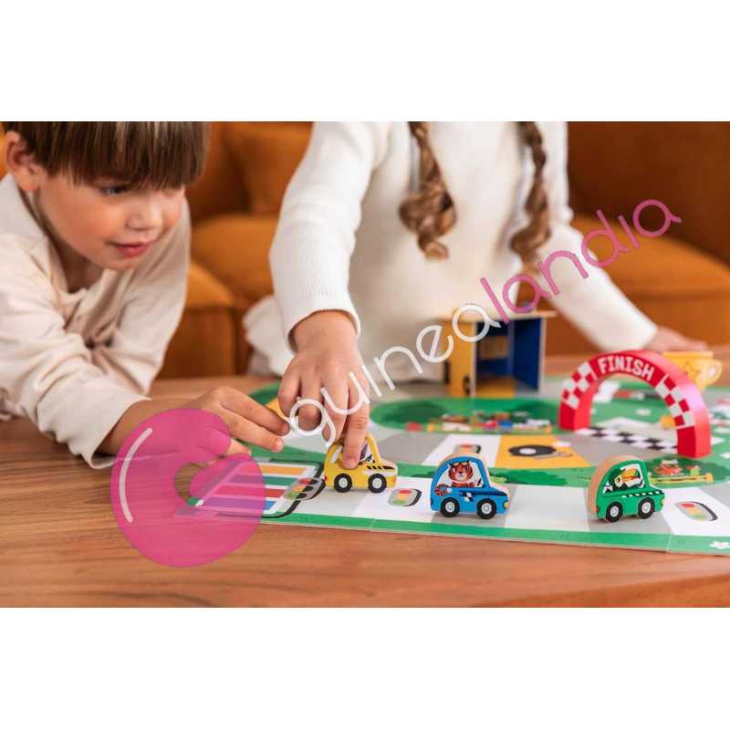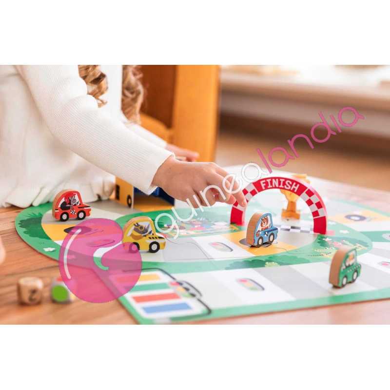 Cada jugador elige su vehículo y avanza por el tablero utilizando dos dados de madera: uno de colores y otro numérico. El objetivo es ser el primero en llegar a la meta, pero durante el recorrido aparecerán casillas sorpresa como semáforos, túneles o accidentes que harán la partida aún más divertida.