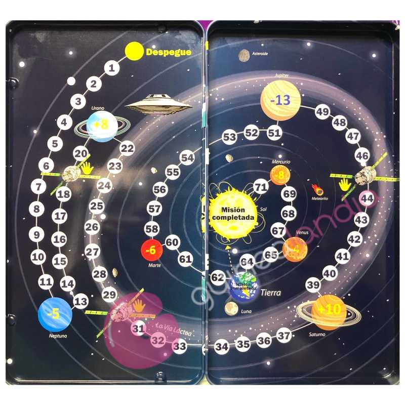 Instrucciones: Cada jugador elige 1 imán de nave espacial. El jugador más joven comienza tirando el dado y moviendo la nave espacial en consecuencia.