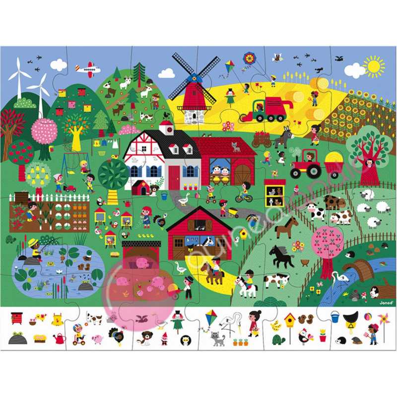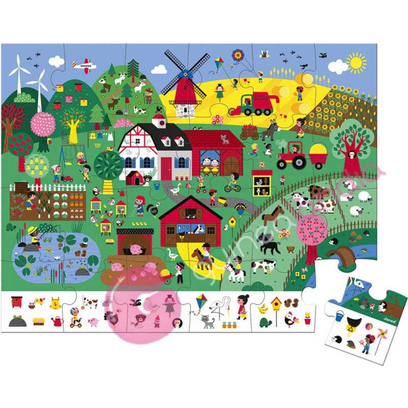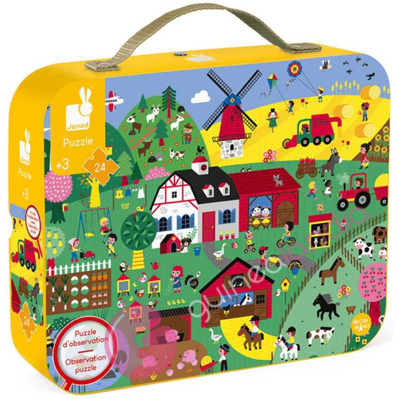 2 juegos en 1: Un puzzle de 24 piezas con la temática de la granja en una bonita caja para llevarlo a todas partes. El tamaño de las piezas está adaptado a las manos más pequeñas para facilitar el montaje del puzle. Cuando haya completado el puzzle, el niño podrá divertirse buscando las 29 ilustraciones escondidas en el puzzle que se indican en la parte inferior de este. Caja cerrada con asa y remache.