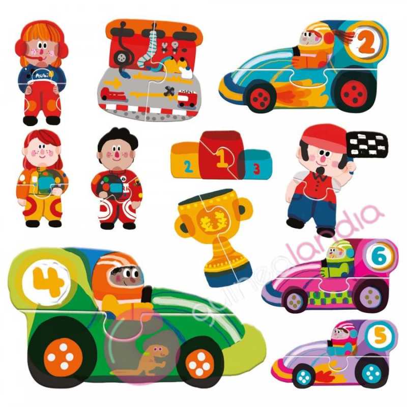 ¡Monta los puzles de la carrera de coches y crea divertidas ambientaciones diferentes entre ellas! Los sujetos, cada uno formado por 2 grandes piezas, tienen encajes con autocorrección y muchos detalles táctiles.